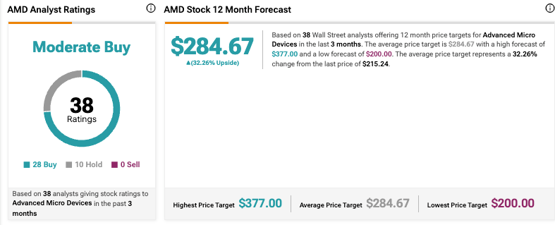 Overall, AMD continues to enjoy strong support from Wall Street, with analysts maintaining a ‘Moderate Buy’ consensus and an average 12-month price target of $284.67. That target suggests roughly 29.5% upside from the stock’s current level.