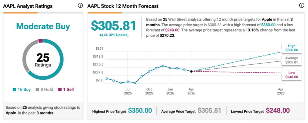 Meanwhile, Wall Street analysts continue to maintain a broadly positive outlook on Apple, with the latest consensus pointing to moderate upside over the next year.