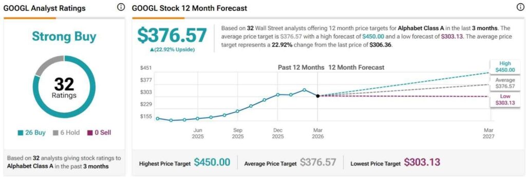 Zooming out, it is evident that Wall Street is, in general, optimistic about the technology giant. For example, Google stock is overall rated as a ‘Strong Buy’ and is, on average, expected to rally 22.92% to $376.57, per the data Finbold retrieved from TipRanks on March 10.