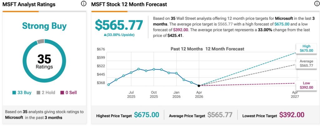 Meanwhile, broader Wall Street maintains a bullish stance on Microsoft, with the stock earning a ‘Strong Buy’ consensus rating based on 35 recent analyst reviews over at TipRanks. Of those, 33 recommend buying the stock, while two suggest holding and none advise selling, underscoring broad confidence in the tech giant’s outlook.