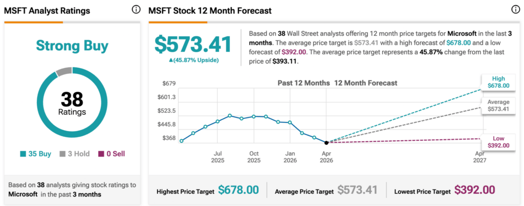 In general, Wall Street analysts are growing increasingly bullish on Microsoft over the next year. According to figures compiled on TipRanks, 38 analysts collectively assign the stock a ‘Strong Buy’ rating, including 35 buy ratings, three holds, and no sell calls.