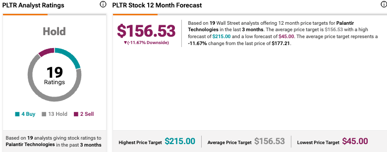 Meanwhile, Wall Street analysts remain divided on PLTR’s outlook for the next year. Based on 19 analysts tracked by TipRanks, the average 12-month price target stands at $156.53, representing an 11.67% decline from the stock’s last price of $177.21.