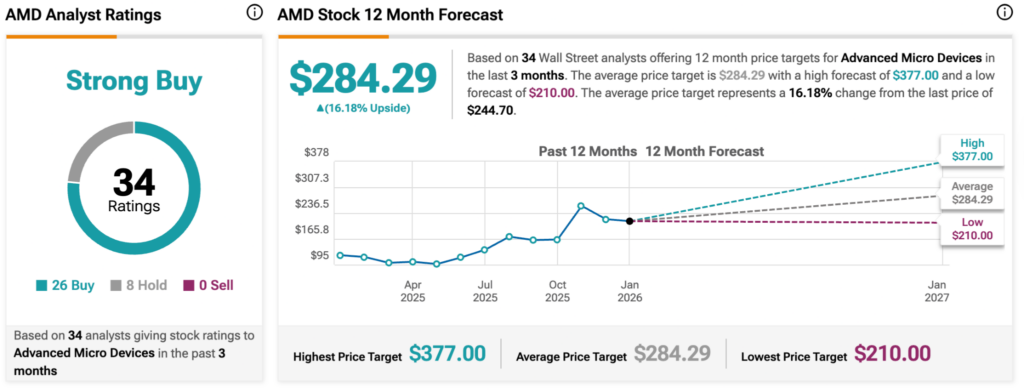 Overall, Wall Street analysts remain bullish on Advanced Micro Devices. Based on ratings tracked by TipRanks, AMD carries a Strong Buy consensus from 34 analysts. Of those, 26 recommend buying the stock, eight suggest holding, and none advise selling.