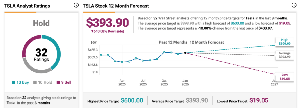 Now, Wall Street sentiment has turned more cautious. Based on forecasts from 32 analysts over at TipRanks, Tesla’s mean price target stands at $393.90, implying a downside of just over 10%.