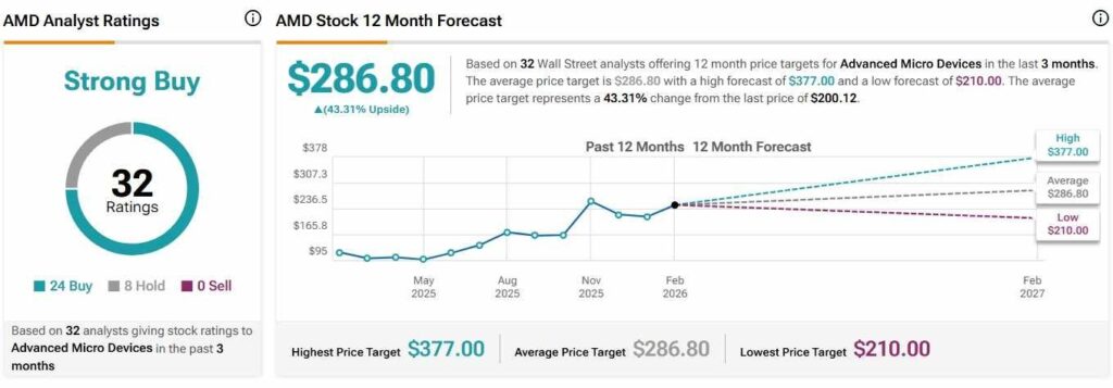 While the most recent notes provided a roughly equal mix of ‘Hold’ and ‘Buy’ rankings, the sum of the last three months paints Advanced Micro Devices stock as a ‘Strong Buy,’ with an average price target of $286.80, per data Finbold retrieved from TipRanks on February 19.