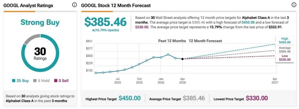 As of the time of writing, the average Google price target for the next 12 months sits at $385.46 according to the same data, implying a projected gain of 15.79%. The highest estimate stands at $450, while the lowest target is $330.