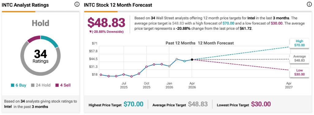 With six “Buy,” twenty-four “Hold,” and four “Sell” recommendations, Wall Street’s consensus on INTC sits at “Hold,” according to TipRanks statistics.