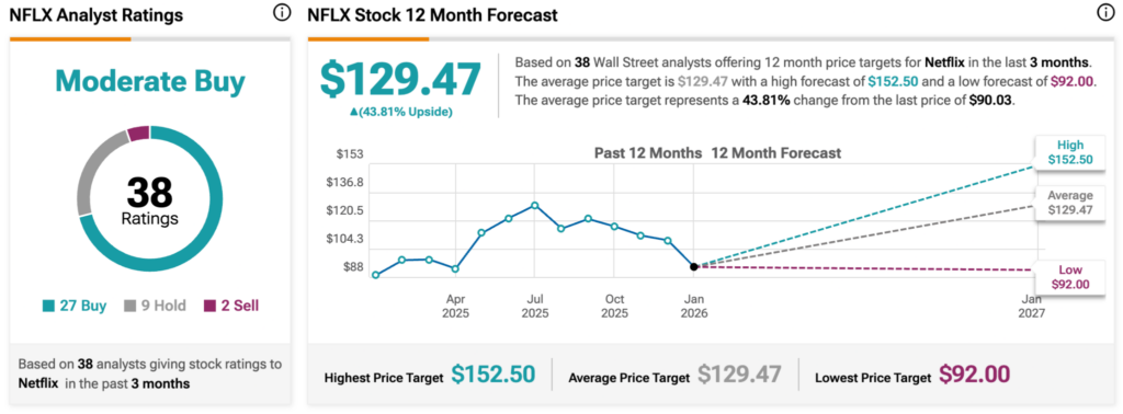Meanwhile, CFRA downgraded Netflix to ‘Hold’ from ‘Buy’ and lowered its price target to $100 from $130, citing concerns over the Warner Bros. Discovery acquisition. The firm pointed to Netflix’s limited history of large acquisitions, Warner’s high debt load, and the risk of a potential bidding war with Paramount that could further increase debt financing needs.