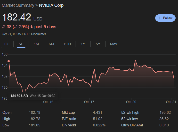 As a result, NVDA stock was trading at $182.42 at the time of writing, down 1.29% on the five-day chart.
