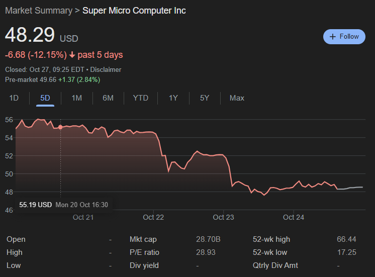 As of the time of writing, Monday, October 27, the SMCI stock is up 2.73% in pre-market, trading at $49.66 and somewhat mitigating its five-day drop of more than 12%.