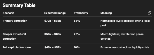 ChatGPT’s primary scenario projects Bitcoin correcting to $72,000 and $85,000, a range it assigns a 65% probability. The AI noted this zone sits just below the $90,000 liquidity pocket and matches past mid-cycle pullbacks where buyers typically return, effectively a “normal correction zone” following a strong local peak.