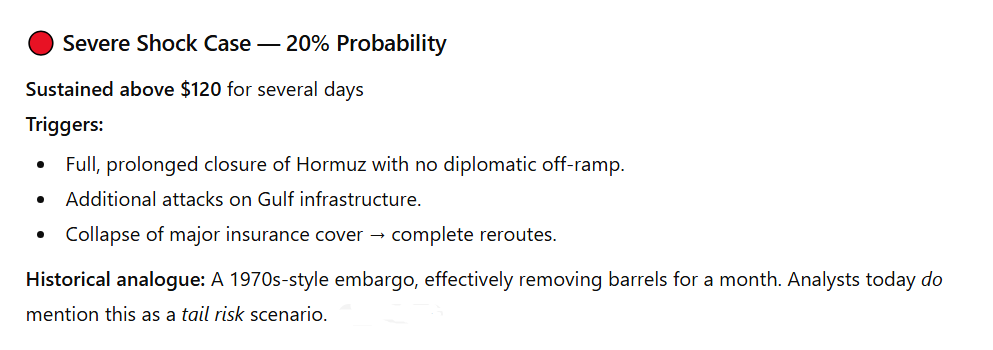 Under such circumstances, ChatGPT estimates that prices are likely to remain elevated but, after the initial reports have been absorbed, not rocket above the $75 to $85 range for WTI and $85 to $95 for Brent. The AI assigned this scenario a probability of 50%.