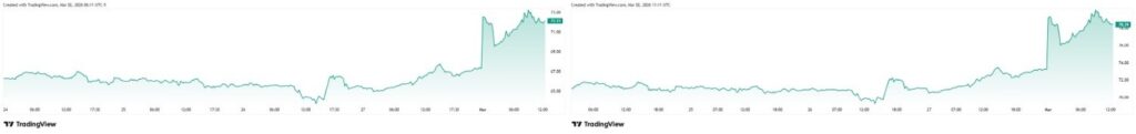 The shipping disruption – paired with attacks on parts of the energy infrastructure in the Arabian Peninsula – led, by press time on March 2, to significant volatility in the commodity markets. WTI and Brent are up approximately 7% in the daily, and 9-10% up in the weekly charts.