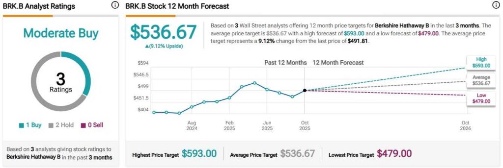 As of the time of writing, the average BRK.B stock price target for the next 12 months is $536.67, a figure 9.12% higher than the current price of $491.81, based on a total of three ratings on the market tracking platform TipRanks.