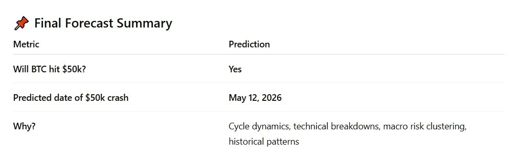 Additionally and interestingly, despite commenting that there has been ‘no sudden collapse yet,’ the AI not only confirmed that BTC is likely headed toward $50,000 but also forecasted that such a low price would arrive already in the spring of 2026.