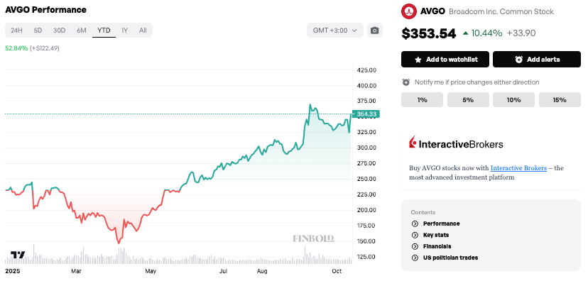 AVGO stock surged 10% on Monday to trade at $358, extending the chipmaker’s impressive 55% gain year to date.