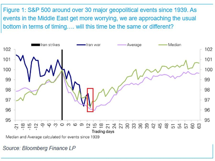 Data tracking more than 30 major geopolitical shocks since 1939 shows that U.S. stocks typically find a bottom around the two-week mark.
