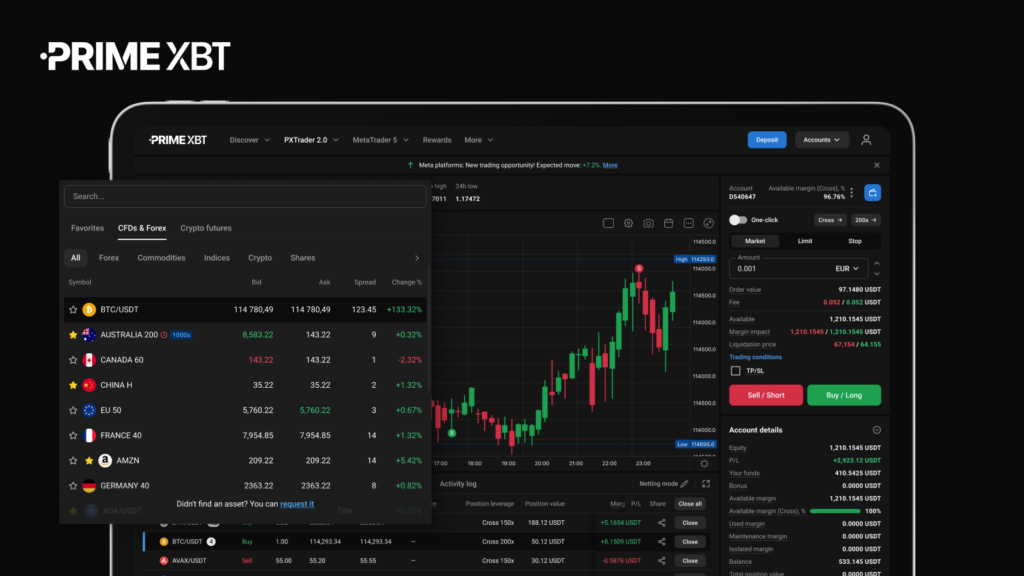 This is the backdrop for PXTrader 2.0, PrimeXBT’s innovative in-house trading platform. Designed to support both Crypto Futures and traditional CFD markets, it gives users access to 350+ markets from one account, combining crypto futures, forex, commodities, indices, shares, and crypto CFDs in one environment.