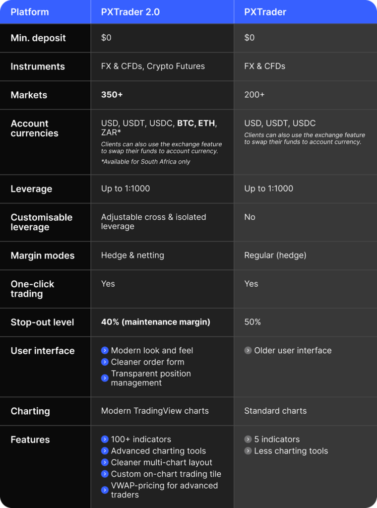 Compared with the legacy PXTrader platform, the new PXTrader 2.0 adds broader functionality across charting, account flexibility, and position management. The comparison below highlights some of the clearest differences.