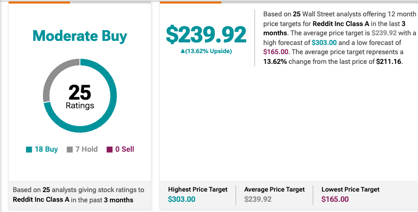 On Wall Street, Reddit currently holds a ‘Moderate Buy’ consensus rating from 25 analysts on TipRanks. Of these, 18 recommend buying the stock while 7 suggest holding, with no sell ratings.