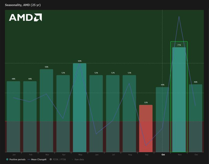 Specifically, AMD’s 25-year seasonality chart indicates that November is historically one of the best months for the stock, with 71% of past Novembers delivering positive returns, according to charting platform TrendSpider.