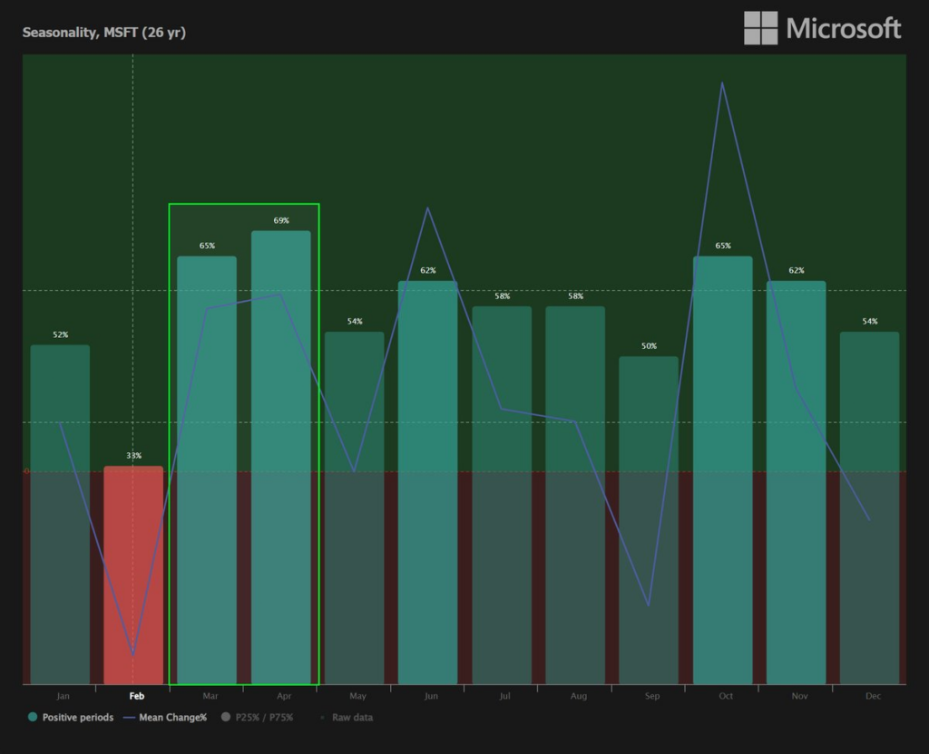Now, the 26-year seasonality chart tracking Microsoft’s monthly performance shows that March and April consistently rank among the company’s strongest months.