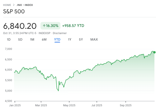 This seasonal strength comes as the market trades near record highs and corporate earnings remain broadly resilient. At the close of Friday’s session, the index was at 6,840, up 0.2%, while year-to-date the S&P 500 has rallied 16%.