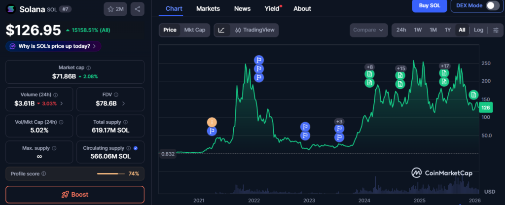 Solana is moving fast as it targets huge growth in early 2026. The current Solana (SOL) price outlook shows a strong bounce to $127.09, marking a 2.72% gain. This recovery follows a recent low of $118.89. Now, the coin is testing resistance at $127. If it clears the $129 pivot, the price could soon hit the $148 range. This energy comes from 2.7 million daily users and $1.3 billion in new stablecoin inflows.